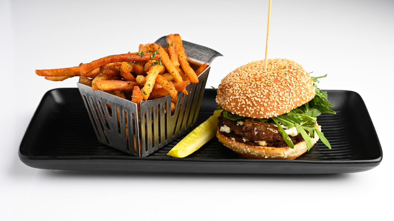 double smash patties, goat cheese, fig jam, arugula, on a buttered & toasted seeded bun