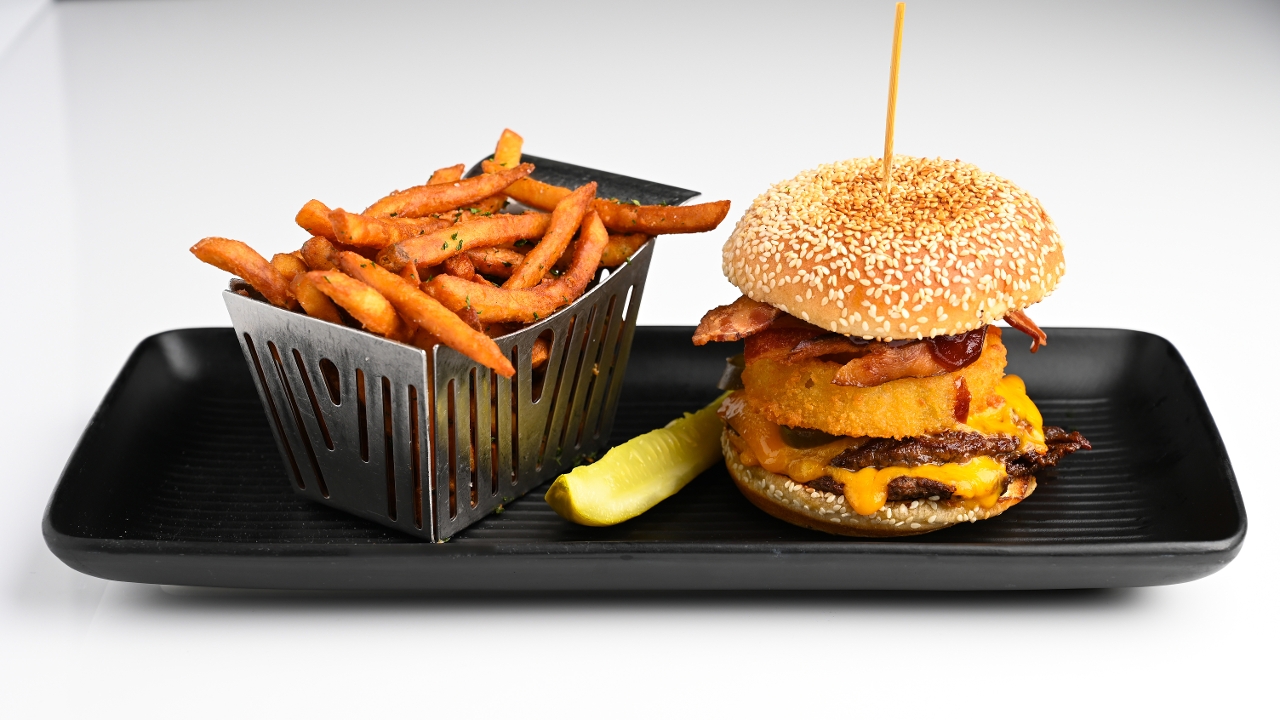*NEW* double smash patties, cheddar cheese, onion ring, golden bbq sauce, bacon, pickled jalapeno, seeded potato bun